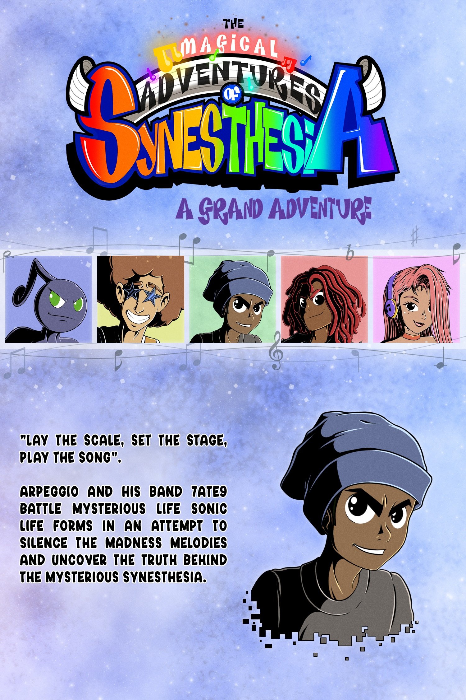 The Magical Adventures of Synesthesia - A Grand Adventure is a brand new manga and story that follows Arpeggio and his band mates 7ATE9 as they battle sonic life forms in an attempt to silence the madness melodies and uncover the truth behind the mysterious Synesthesia.